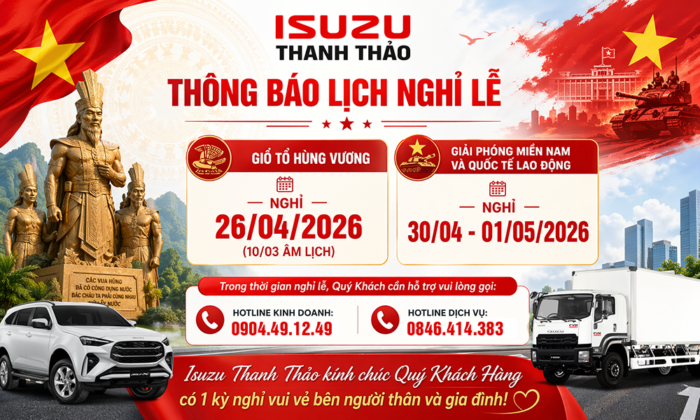 Isuzu Thanh Thảo xin trân trọng thông báo lịch nghỉ lễ GIỔ TỔ HÙNG VƯƠNG, GIẢI PHÓNG MIỀN NAM VÀ QUỐC TẾ LAO ĐỘNG như sau: