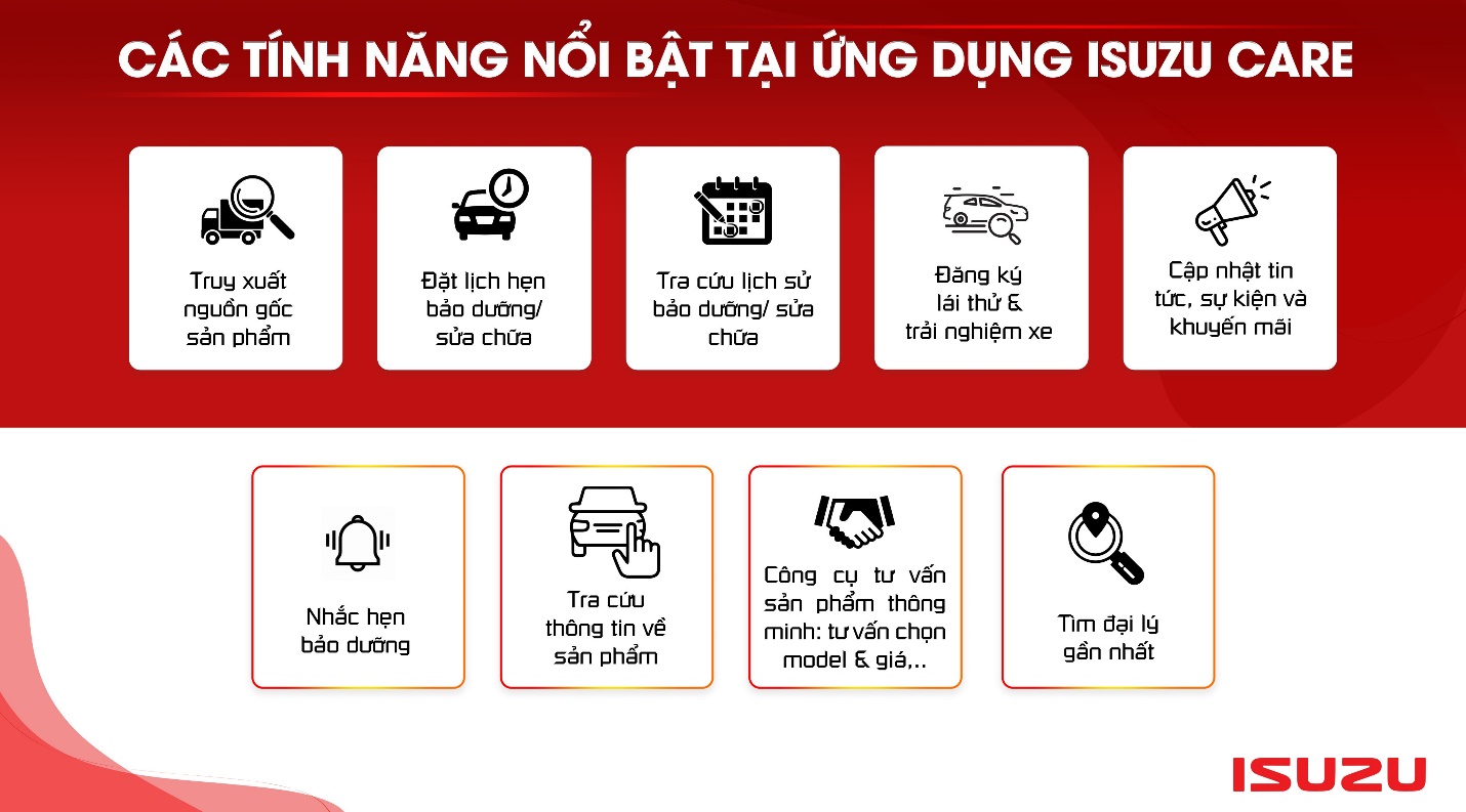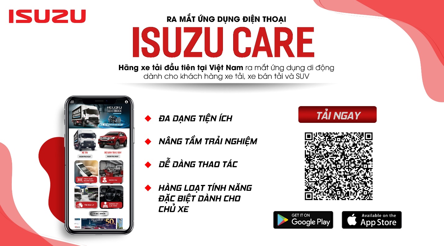 Ngày 31/07/2020, ISUZU chính thức trở thành hãng xe tải đầu tiên tại Việt Nam ra mắt ứng dụng di động dành cho khách hàng sử dụng xe tải, xe bán tải & xe SUV mang tên: ISUZU CARE. ISUZU CARE được ra mắt với mong muốn đem đến sự trải nghiệm mới mẻ cho người dùng cùng những tiện ích và tính năng vượt trội.