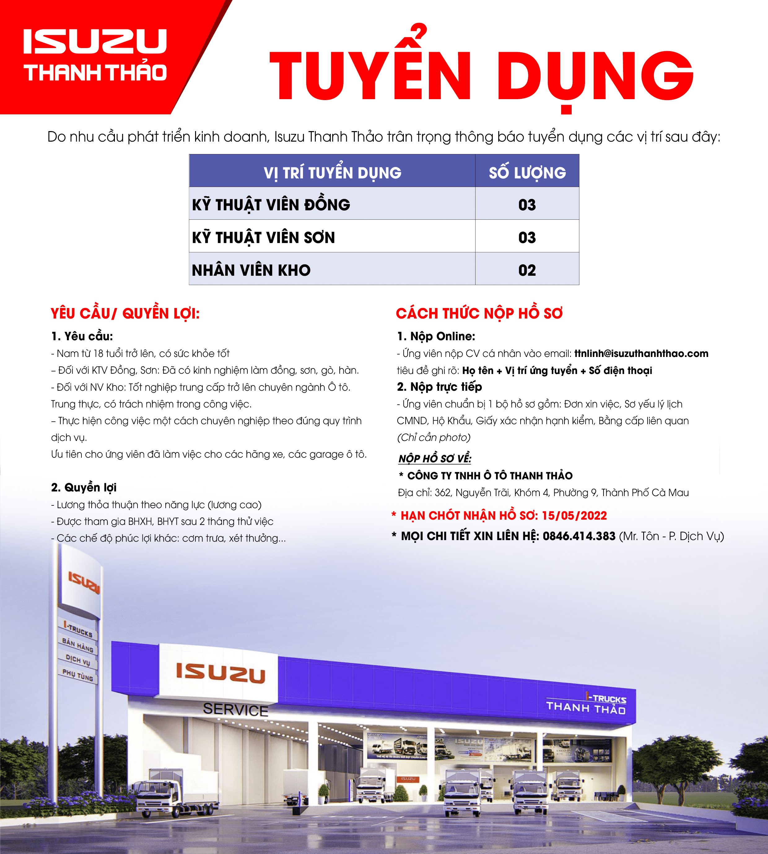 Do nhu cầu phát triển kinh doanh, Isuzu Thanh Thảo thông báo tuyển dụng các vị trí sau: