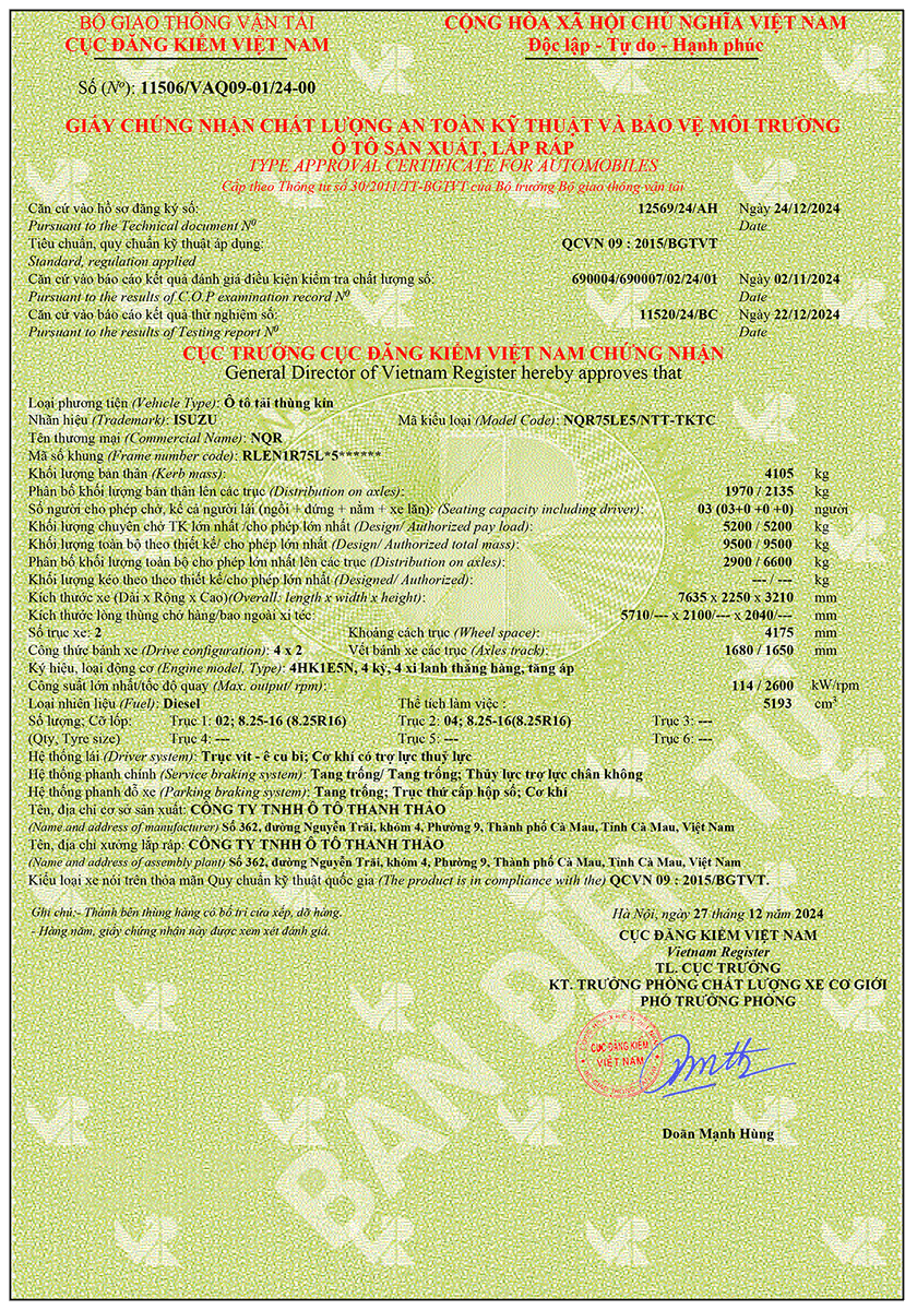 | Tải trọng cho phép chuyên chở | 5.200 Kg | |
